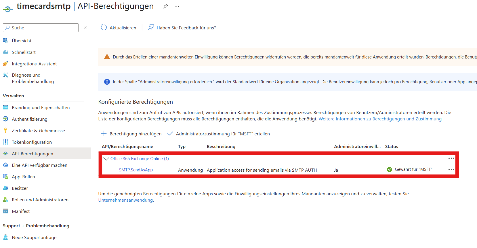 Beachten Sie, dass "timecardsmtp" hier auch für einen beliebig von Ihnen gewählten Namen stehen kann, welchen Sie bei der App-Registrierung in der EntraID-Verwaltungskonsole vergeben haben.Get-AzADServicePrincipal -displayname timecardsmtp