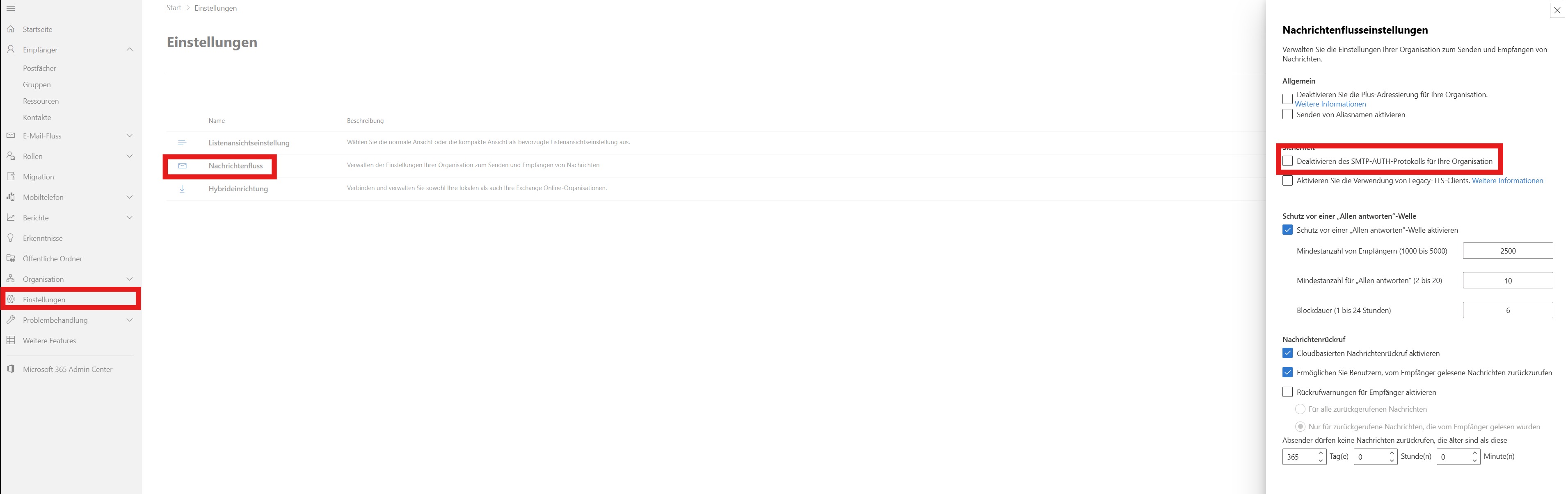 Ist "SMTP" nicht aktiviert, muss im Portal "https://admin.exchange.microsoft.com/ " unter "Einstellungen -> Nachrichtenfluss" der Haken bei "Deaktivierung des SMTP-AUTH-Protokolls für ihre Organisation" entfernt werden. Dieser darf nicht gesetzt werden.