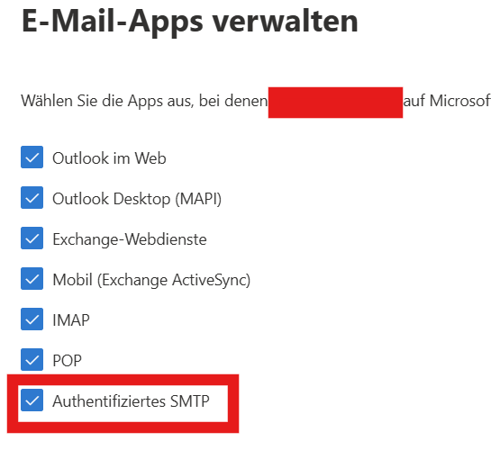Ist "SMTP" grundsätzlich aktiviert, muss dies auch noch beim ausgewählten bzw. angelegten Benutzer aktiviert werden. Hierzu im Portal "https://admin.cloud.microsoft/:" unter "Aktive Benutzer -> Ihren Benutzer wählen -> In den Benutzereinstellungen den Reiter "E-Mail" klicken -> E-Mail-Apps verwalten" den Haken bei "Authentifiziertes SMTP" setzen.