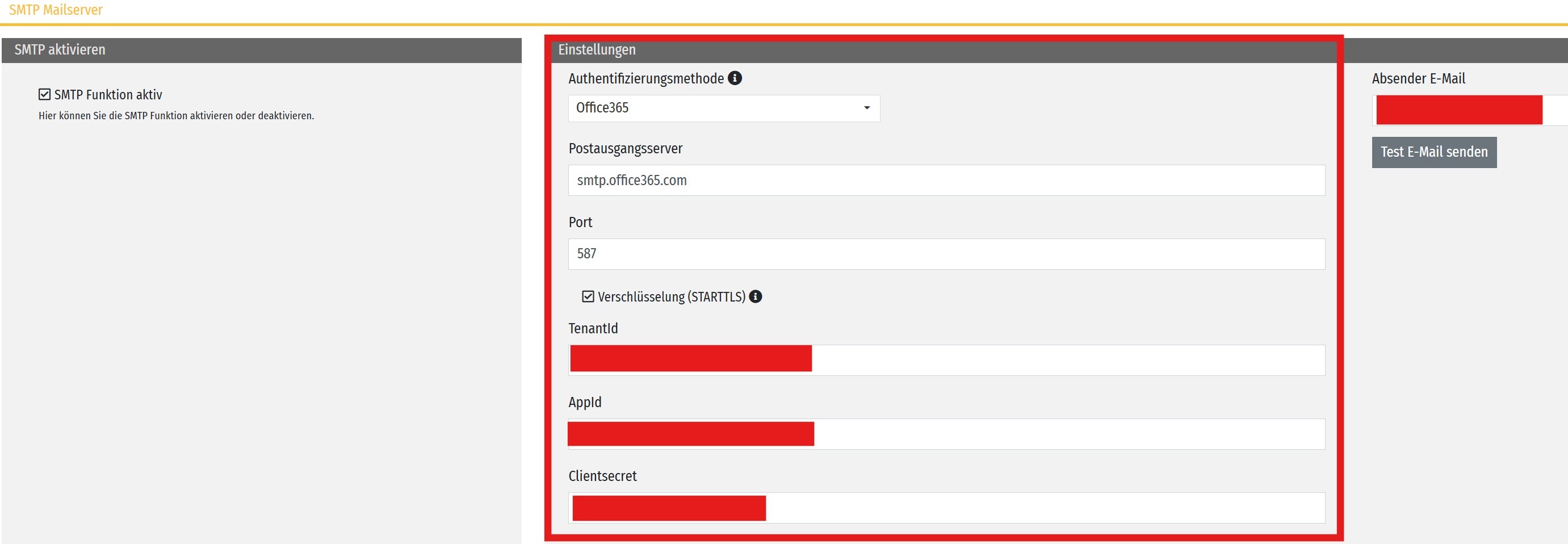 Nun müssen Sie die EntraID-Verbindungsparameter in timeCard hinterlegen. Hierzu gehen Sie unter "Allgemein -> Einstellungen -> SMTP Mailserver" setzen dort den Haken "SMTP Funktion aktiv" und wählen Sie als Authentifizierungsmethode "Office365". Dort geben Sie dann die folgenden Verbindungsparameter aus Schritt 4 des von Ihnen gewählten Absenders ein:
