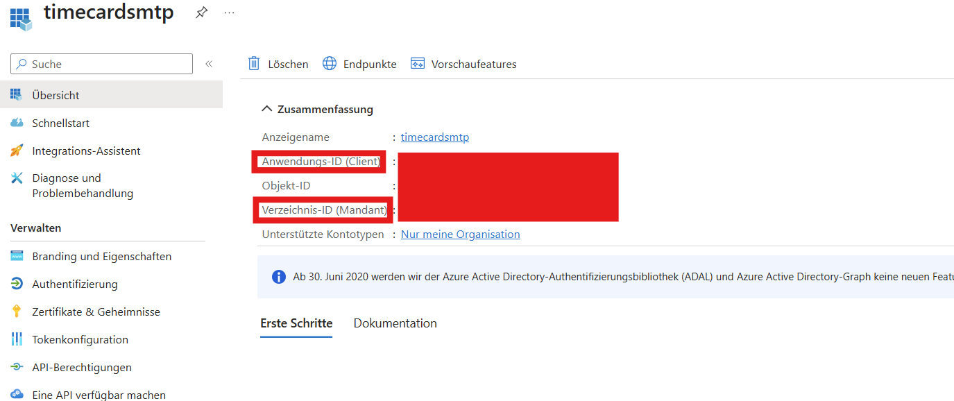 In der Übersicht dieser Ressource finden Sie auch die beiden anderen Verbindungsparameter (Anwendungs-ID/Verzeichnis-ID). Diese müssen in Schritt 4 in timeCard eingetragen werden.